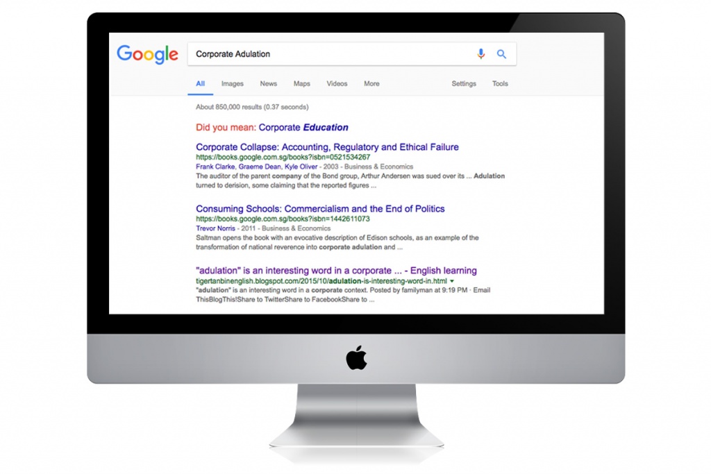 I was very keen to find out if my curiosity on this topic could lead me to some research .However, I was surprised when I found Google didn't recognise the phrase Corporate Adulation and thought I was looking for Corporate Education (see image below )